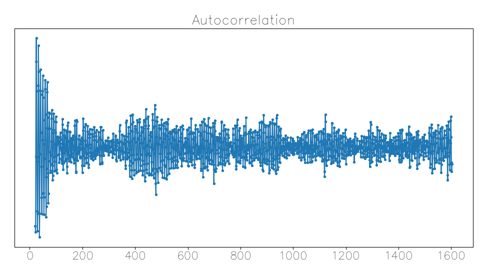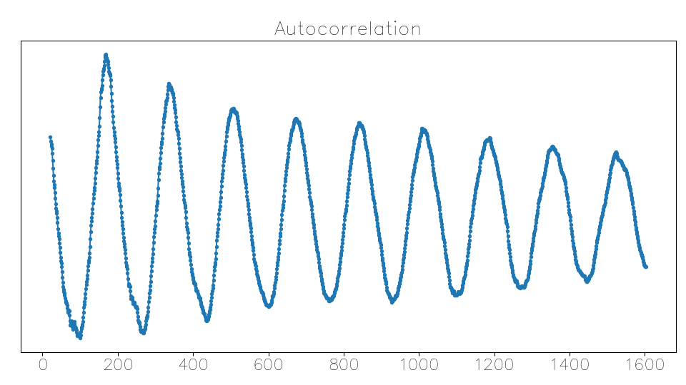 We want this term to be high (we want the sum of square differences to be low, and the autocorrelation term was subtracted in the SSD expansion). As some intuition, when the waves align after a specific lag (so that we’re at the period, or an integer multiple of it), the positive elements of the signal array and the lagged signal will multiply together, and the negative parts of both will also multiply together to make positive numbers. But if the lagged signal is out of phase with the original signal, then we’d often be multiplying a positive number by a negative number, reducing (or making further negative) the autocorrelation at that lag.