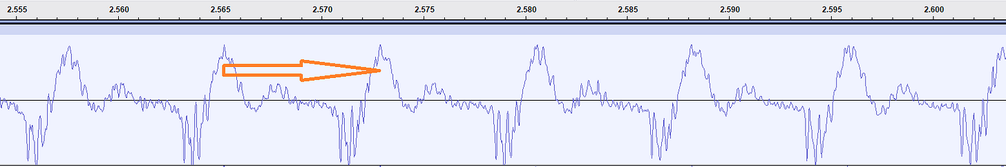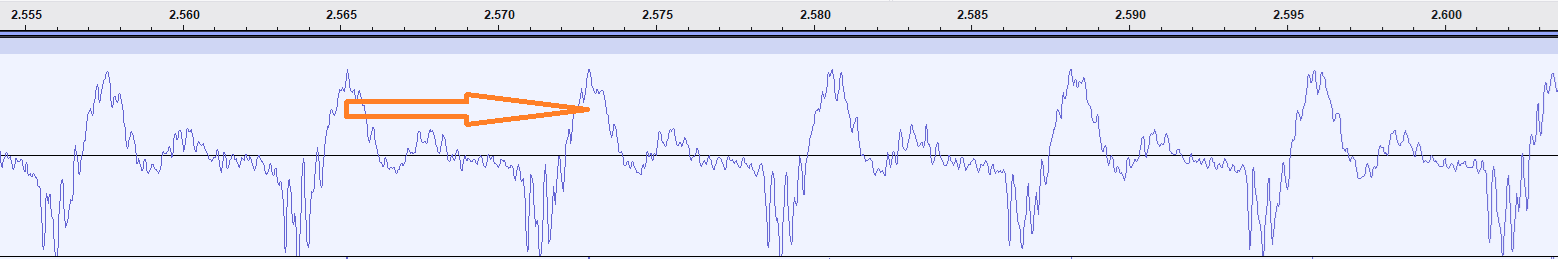 Here is a screenshot from Audacity showing part of the Cat Stevens clip, to which I’ve added an arrow indicating one period; the tick values across the top are times: