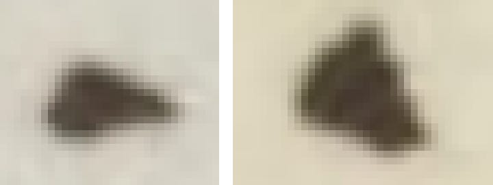 Sometimes a mark is transcribed as a full stop; here is a zoomed comparison between one of these (right) and the very short dash above (left):